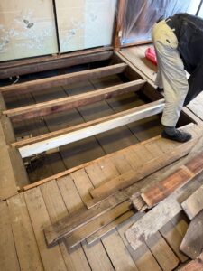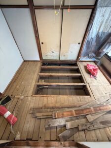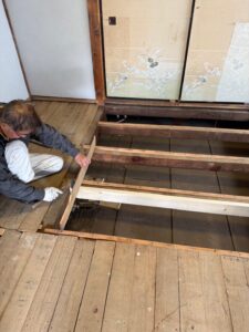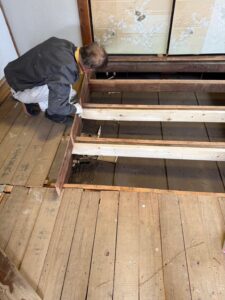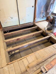 ↓根太組みの補強工事が始まります
