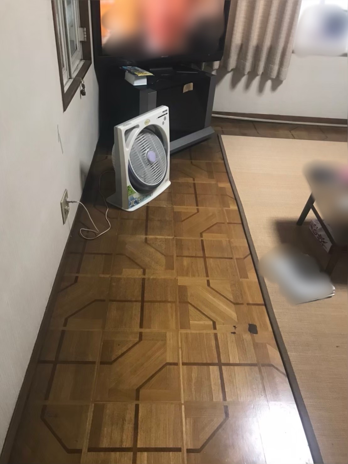 ↓柄の入ったフローリングはシンプルなものに張り替えていきます