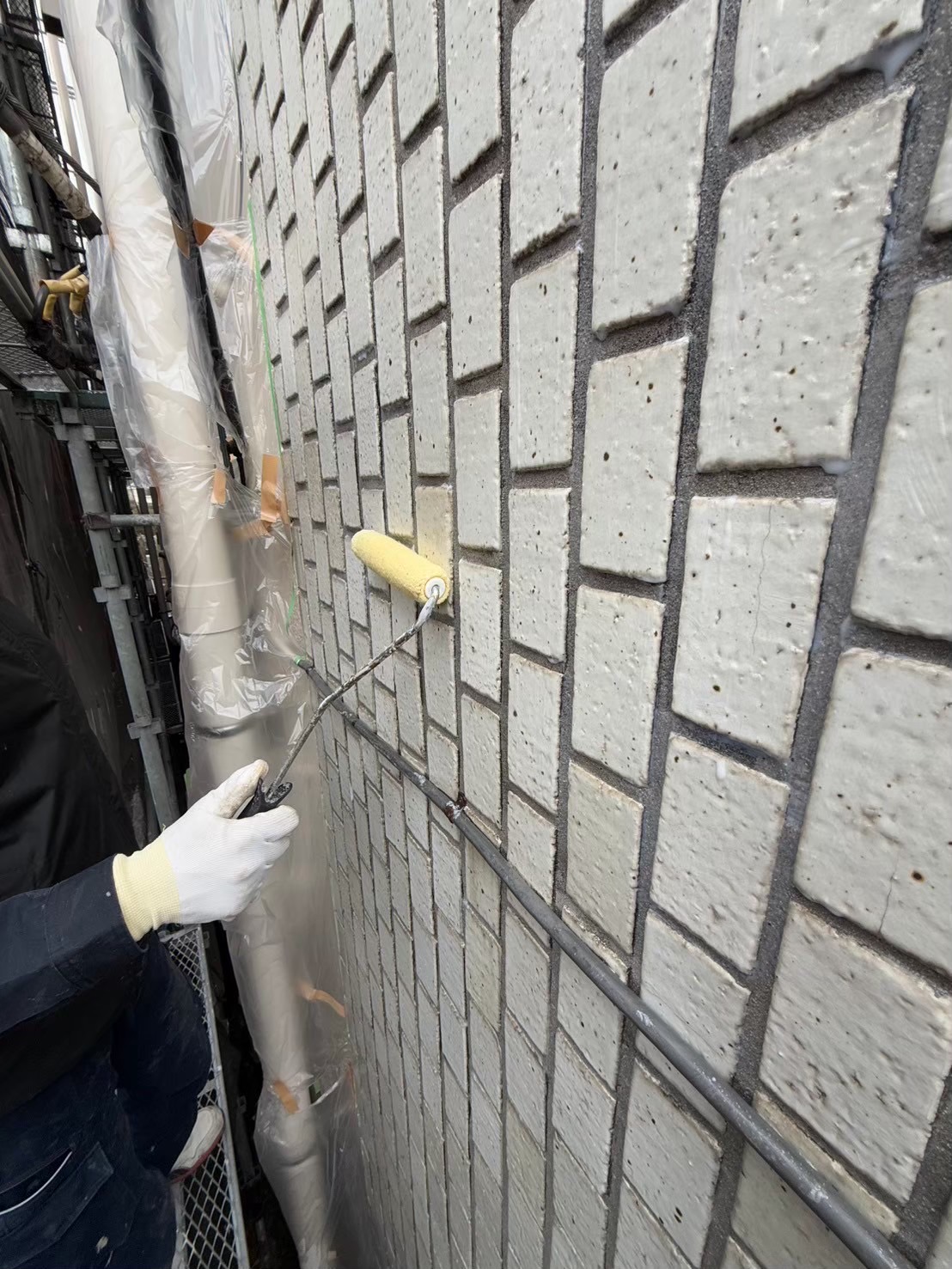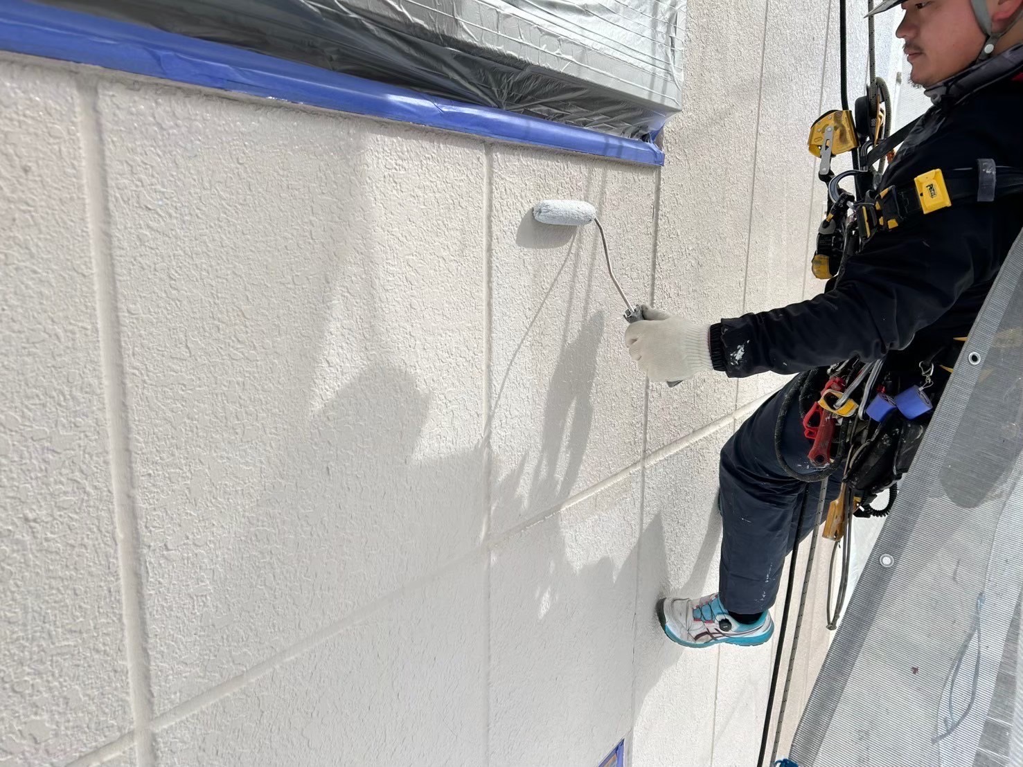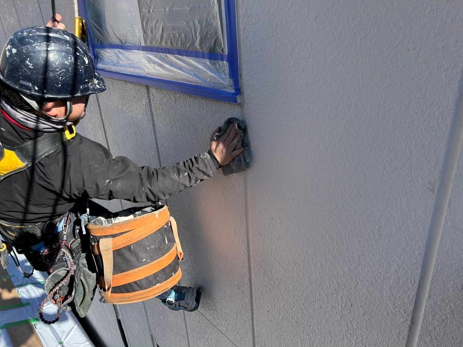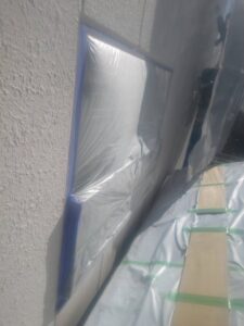 ↓高圧洗浄後、窓枠等の養生作業、その後 塗装工事に進みます
