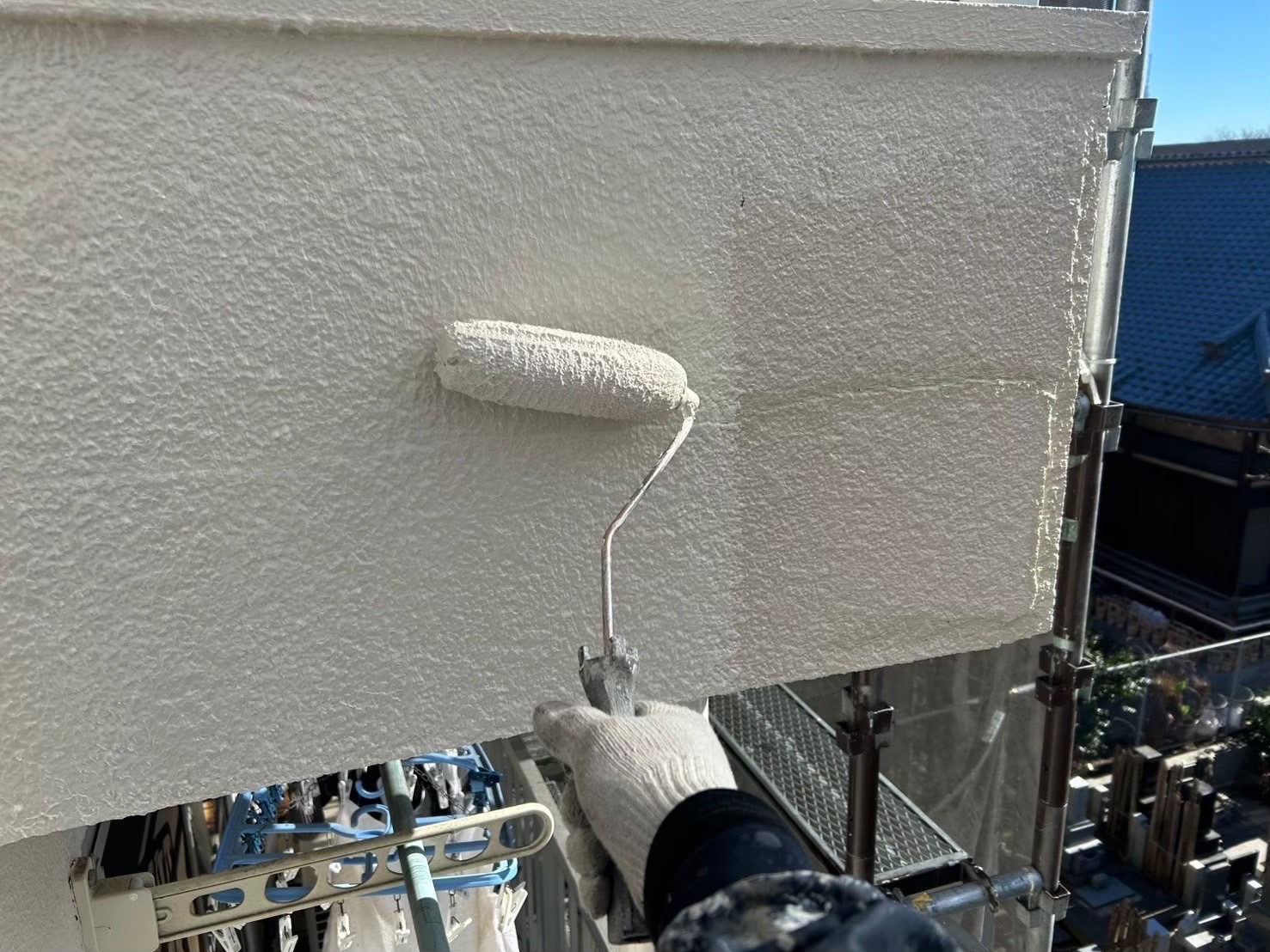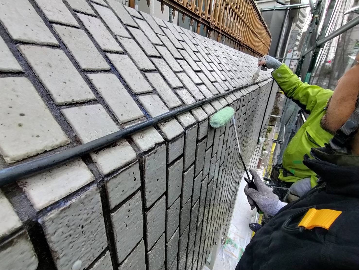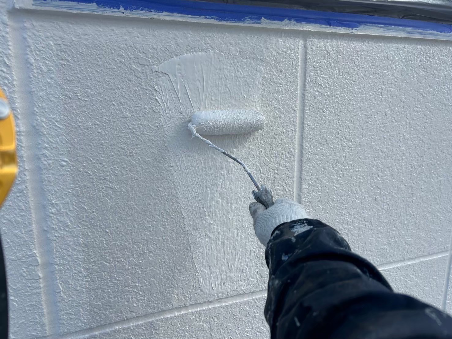 ↓高圧洗浄後、窓枠等の養生作業、その後 塗装工事に進みます